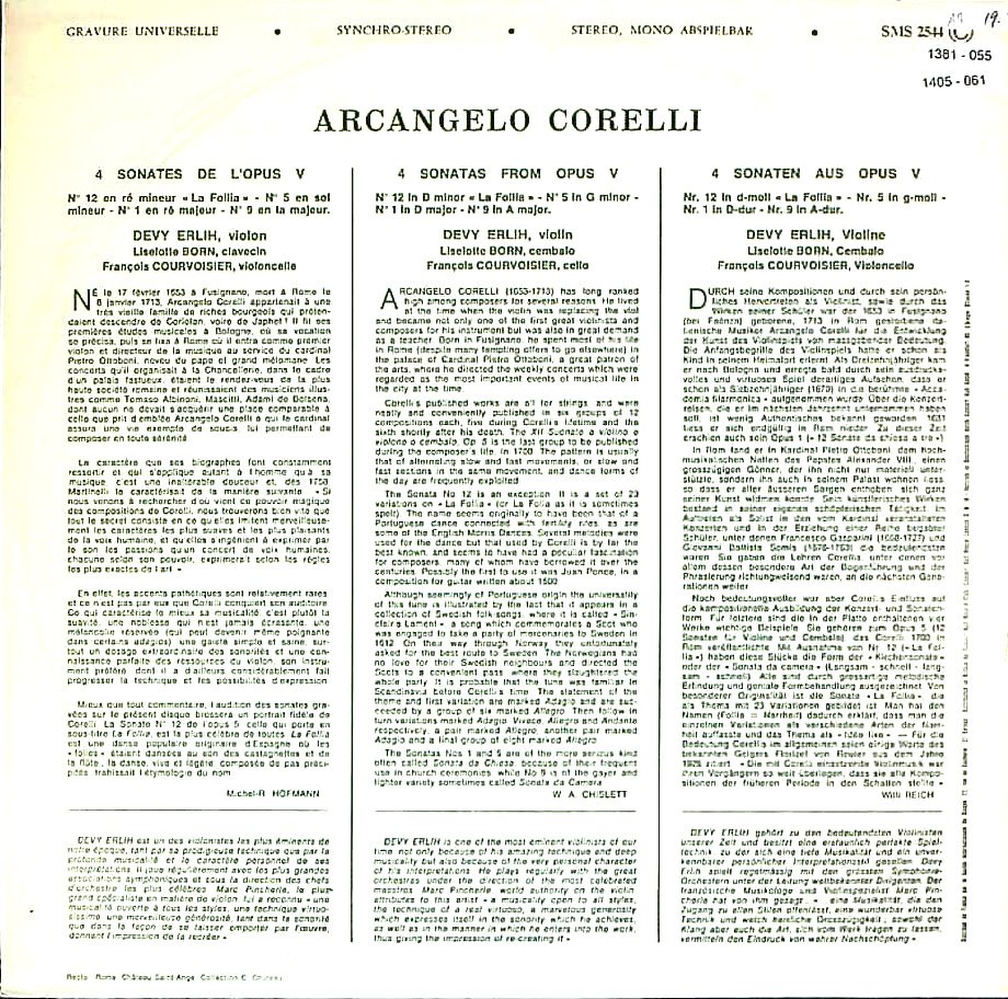 商品詳細:D.エルリの大変珍しいConcert Hall系録音。時期的には、デュクレテ・トムソンの後、ADESへ録音を始めた中間の'60年代後半の1967年頃と思われる。エルリの唯一のConcert Hall録音になる。ラ・フォリアを含むコレッリのVnソナタ4曲を、チェロの通奏低音を含むチェンバロ伴奏で弾き切る。彼の鈴を鳴らしたような美音がたっぷり入っている。Vcの参加もあり、音楽自体がふくらみを持って語られ、貧弱ではない。ソナタの少ない彼の録音の中で、光を放つ一枚だ。A/B面全てにこの名人の音がステレオで満喫できる貴重盤!デヴィ・エルリ(1928-2012)はパリ生まれのヴァイオリン奏者。パリ音楽院でジュール・ブーシュリに師事。1955年、ロン=ティボー・コンクールで優勝、その年に初来日している。1980年代以降、度々日本を訪れ、多くの音楽祭に出演したり後進の指導にあたった。2012年2月、交通事故によって死去。但しエルリのことが知られるようになったのは2000年頃からではないだろうか。一部のモノラル初期LPが高騰し、エルリの盤にも高値が付くようになり始めてからと思われる。特にラロの「スペイン交響曲」の圧倒的なソロは、アンゲルブレシュト指揮もあって一度でも聴いた方には強烈な印象が残ったことだろう。燃え滾るようなアグレッシヴながら自由度の高いスタイルは個性豊かであり、誰とも似ていない。クライスラーの小品やバッハの無伴奏ソナタ&パルティータ全曲も録音している。録音はデユクレテ・トムソン→Le Club francaise du Disqueの後、1969年頃ADÈSに移籍した。Ducretet Thomson時代には珍しいロマン派作品の録音がある。美音を隠すこともなくラテン的に鳴らした、よく歌うソロが印象的で前のめりのような姿勢はここでも健在。弱音部で艶やかな妖しいビブラートを振りまき、パガニーニなどの技巧曲も得意としたエルリだが、ロマン派作品には情に振れ過ぎない、ややクールなソロを展開する。この時39歳であり、ヴァイオリン奏者として絶頂期を感じさせる表情で料理している。元々エルリは大作をバリバリ弾くタイプの奏者ではなかった。パワーの点では、同時代の奏者に一歩譲るような気がする。エルリの魅力はパワーよりデリカシーであり、美しい音色にある点を理解した上で聴くべきだろう。