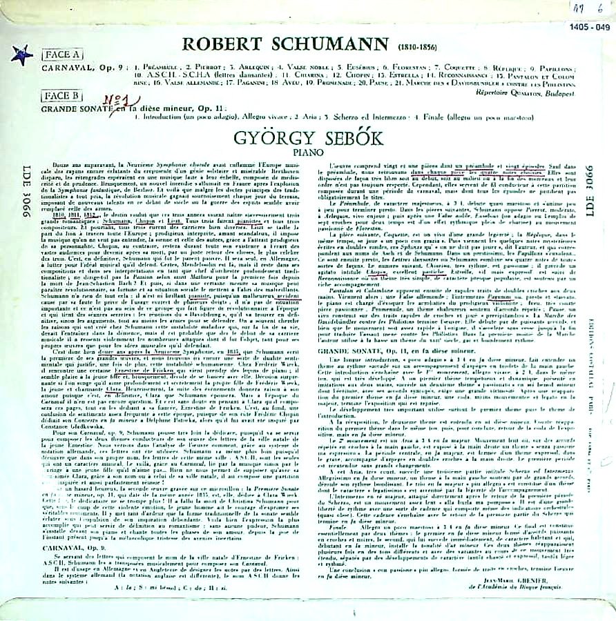 商品詳細:ジェルジ・シェベーク(1922- 1999)は、ハンガリー・セゲドの生まれ。11歳でソロ・リサイタルを開き、14歳でベートーヴェンのピアノ協奏曲第1番をフェレンツ・フリッチャイと共演するなど、神童振りを発揮した。16歳のときにリスト・フェエンツ音楽大学に入学してコダーイ・ゾルターンやヴェイネル・レオーらの薫陶を受け、卒業後は欧米やロシアなどで演奏活動を始め、ヤーノシュ・シュタルケルらとも度々共演を重ねた。1949年からはブダペストのバルトーク・ベーラ音楽高等学校のピアノ科教諭に就任するも、1956年のハンガリー動乱の影響でパリに亡命を余儀なくされた。このとき、シュタルケルの援助によってブルーミントンのインディアナ大学の教授となった。また、ベルリン高等音楽院や桐朋学園大学などにも招かれてマスター・クラスを開き、後進の指導に熱心に当たった。欧州ではERATOとPHILIPSを中心に非常に多くの録音を残すも、その大半が室内楽である。ヤーノシュ、グリュミオーらが好んでシェベークの伴奏を希望するようである。それでもERATOではソロ録音が多い。中でもドビュッシーは唯一の録音で、フランス人ではないピアニストがフランスを代表するレーベルにソロで録音を行うとは名誉なことだろう。シェベークは教授活動に忙しく演奏家としてはあまり知られていないという話もあるが、当社のお客様に限ってはそうではないだろう。彼のピアノは一見地味ではあるが、正攻法に弾いた味わい深さが並外れており、特にプロの音楽家に好まれている。シュタルケルがDECCA以外では彼としかデュオを組まなかった理由はよく聴いてみればわかるような気がする。シェベークのLPを1枚だけ選ぶとすればこの盤が良いかもしれない。非常に単純な曲ばかり集めたLPだが、単純な程素性があからさまになってしまうので、高名なピアニスト程やりたがらない曲なのである。シェベークの謝肉祭はかなり遅いテンポでゆったりとした演奏。過度な情感を抑えてはいるがロマン的なスタイルを保つ。Pfソナタ1番は詩的な解釈がシューマンの作品と調和した美しい演奏である。地味ではあるが堅実で味わい深いシューマンである。シューマンは他に「子供の情景,蝶々,幻想小曲集」と:Pf協奏曲+αがあるだけである。