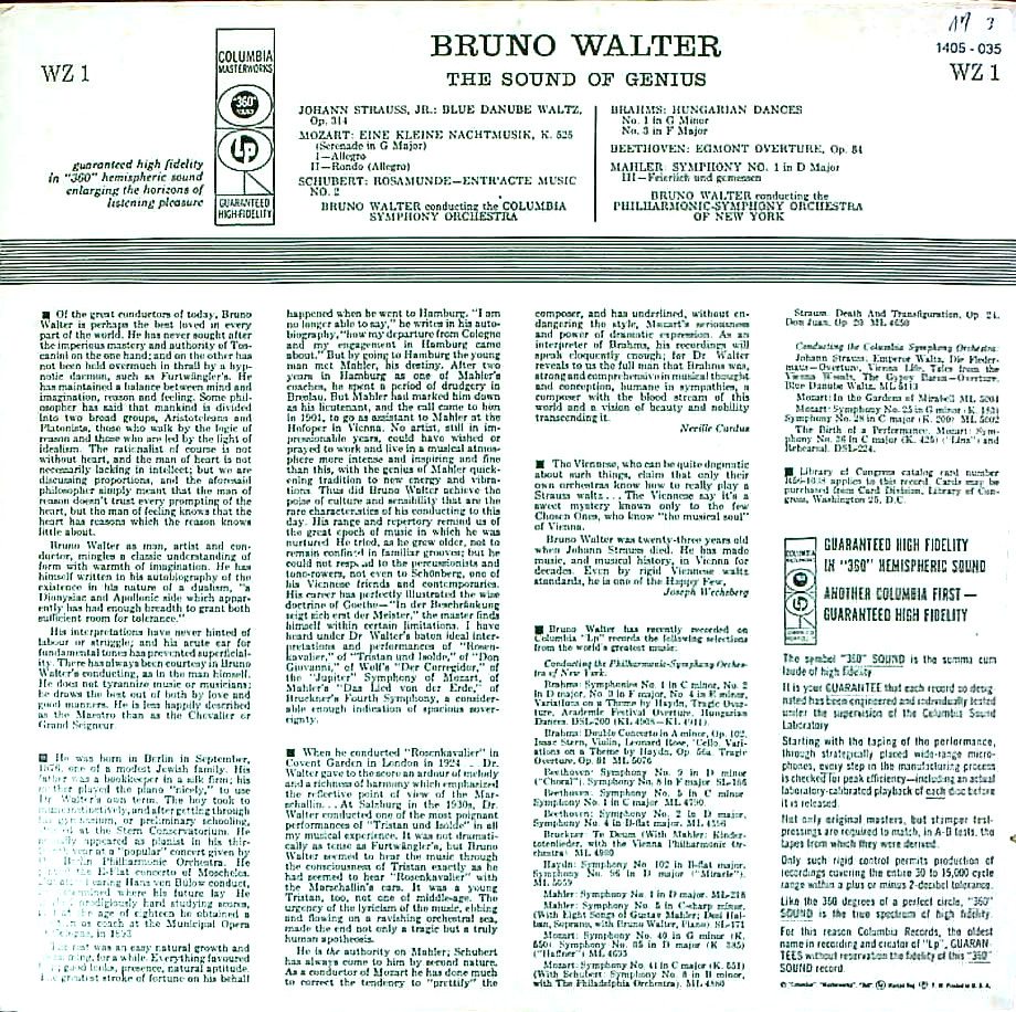 商品詳細:このLPは1956年頃ニューヨークでモノラル録音されたワルターの代表的な録音を凝縮したコンピレーション(オムニバス)形式となっており、彼が得意としたモーツァルトやマーラーなどの重要なレパートリーが含まれている。WZ 1という番号は特別プロモーションシリーズの第1弾となる。当時、巨匠ブルーノ・ワルターを広く世間に再認識させるためのダイジェスト・コンピレーションとして企画された。価格設定も通常盤より安価な1.98ドル(当時の通常盤MLは約4ドル前後)に抑えられ、多くのファンに普及させるための「入門編」的な役割を持っていた。入門向けに様々な楽曲の抜粋を集めたサンプラー的な構成となっている。豪華な解説冊子(ブックレット)がジャケットと一体化しているのが特徴で、ジャケットに丸い穴が空いていて、ブックレットの表紙のワルターの顔が表紙となる仕掛けとなっている。音楽だけでなくワルターの生涯や芸術を視覚的にも楽しめる「特別仕様」になっている。このLPにおいて重要な物はこのカラー仕立ての12ページのリブレットであり、そこにはワルターの写真が多く、またCOLUMBIAのLPカタログを兼ねている。いわゆる販売促進を兼ねたLPであった。このWZ 1で気に入った曲があれば、その全曲版が収録されたML盤を販売する目的も感じられる。米国以外ではPHILIPSから、 S 04646 L( Philips Favoriten Serie)で発売された。ワルターのファン向けのLPである。