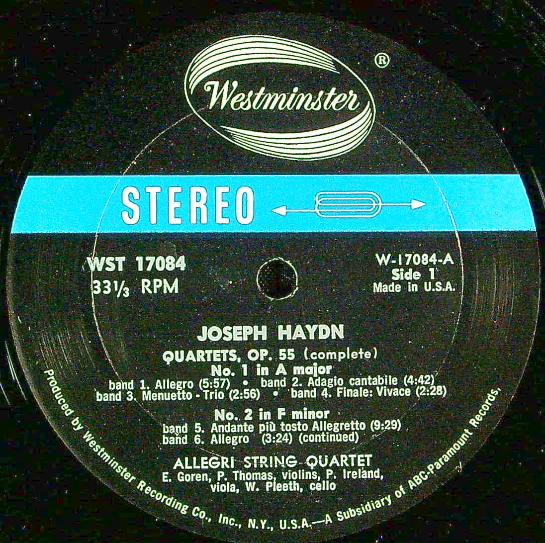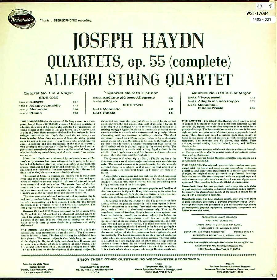 商品コード:1405-031[WESTMINSTER] アレグリQt. / ハイドン:第2トスト四重奏曲集Op.55(全3曲)/60, 61「剃刀』, 62番
