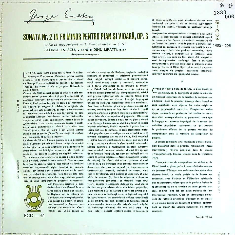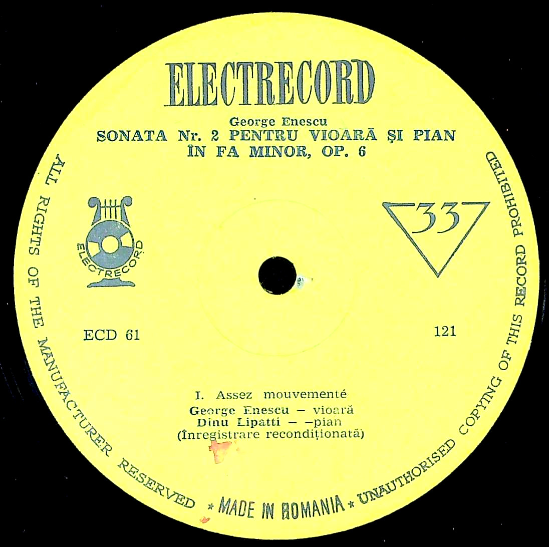 商品詳細:エネスク自作自演のVnソナタ2番はリシェ伴奏のREMINGTON録音と、リパッティ伴奏のこのルーマニア録音との2種がある。録音はREMINGTONの方が古いが、これも1943年ルーマニア放送局のための放送用モノラル録音。帯域は狭いが、エネスクの瑞々しいVnの音は完全に収録されており、SP期でしか聴けないような、神がかった音をはっきりと聴くことができる。幻想的な世界。初期レーベルのモノラルは大変音質が良い。曲を聴くというより、エネスクの世界を垣間見るというのが正しい!この録音はルーマニアのElectrecord以外では発売されていない。1958年ルーマニア・ブカレストで行われたジョルジュ・エネスク国際音楽祭コンクールのための出品LPとしてLP可された10"である。来場者、関係者が購入して手土産に持ち帰るのに10"は丁度よい大きさであった。この10"はこの国際音楽祭・コンクールの象徴として1970年頃まで現地の売店で入手出来たと思われる。その為、フランス、ドイツ等の市場に存在する。1958年の初年度分は特製棒付きジャケットに入る10"でフラット盤が入る。それは当社でも一度入荷しただけの希少品で盤質も良くないだろう。市場にある大半の盤は1965年頃製造の黄/銀内溝レーベルである。