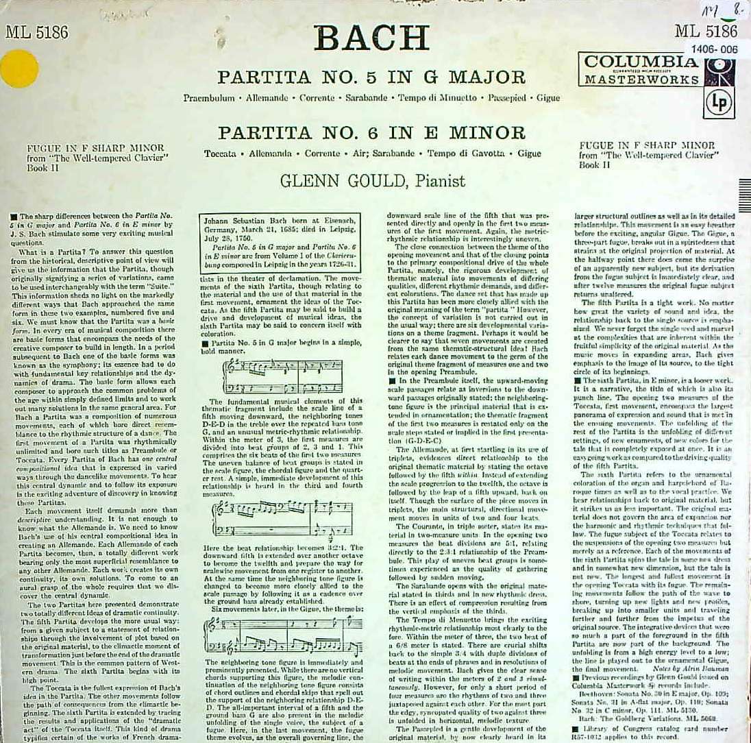 商品コード:1406-006[COLUMBIA] G.グールド(pf) / バッハ:パルティータ全集vol.1/パルティータ第5番BWV.829, パルティータ第6番BWV.830, フーガBWV.878&BWV.883